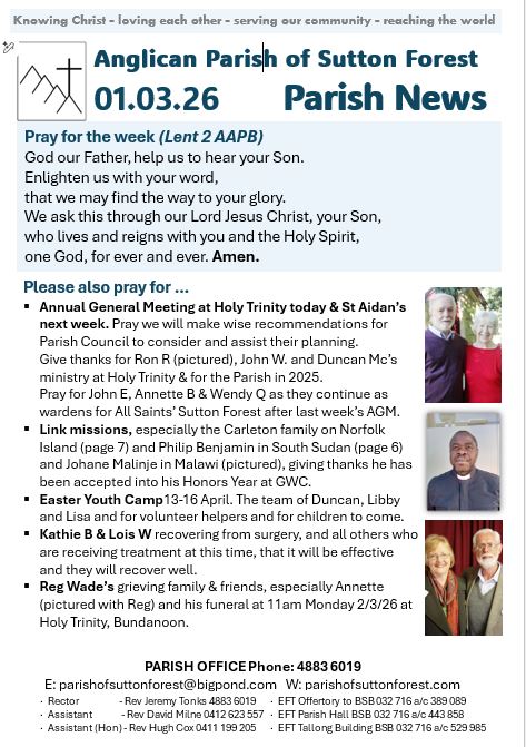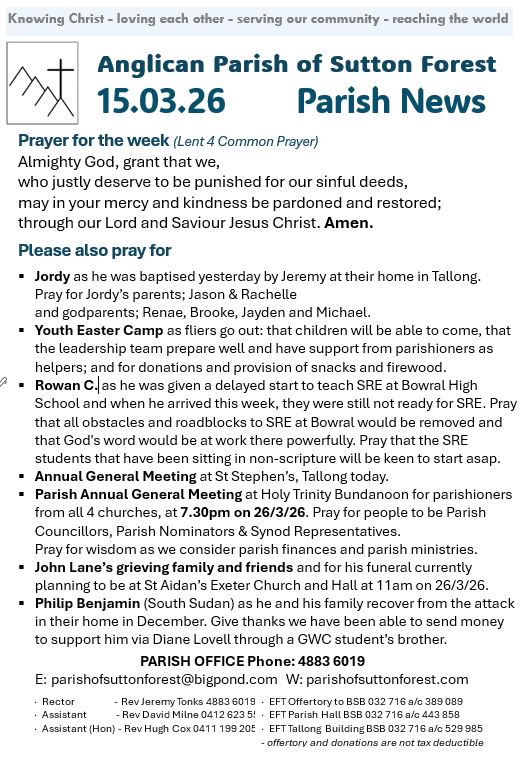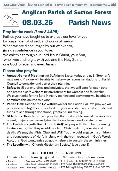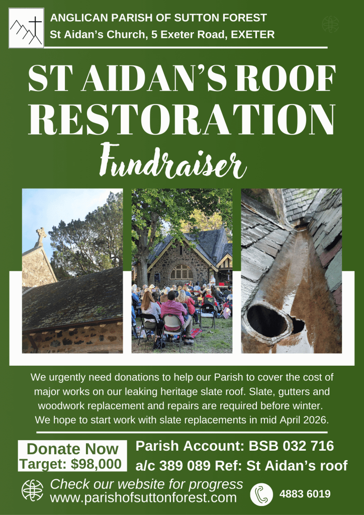 Phone: 4883 6019 The Parish Office in Bundanoon is usually open 9am to 12 noon Monday to Thursday and at other times by appointment. Note: Danielle is a JP, available when the office is open. ST AIDAN’S ROOF RESTORATION Fundraiser: $42,000 of $98,000 raised by 18/3/26.